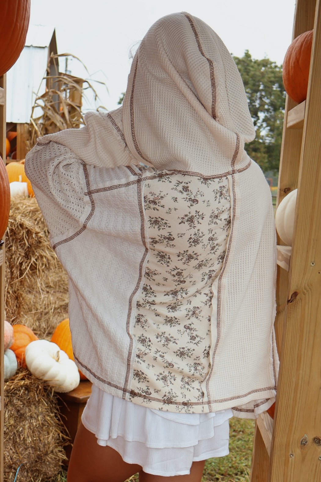 Designed in placket hoodie, balloon sleeve, semi cropped fit top in thermal and cut and sew knit mix with overlock stitch detail pointed floral pattern.