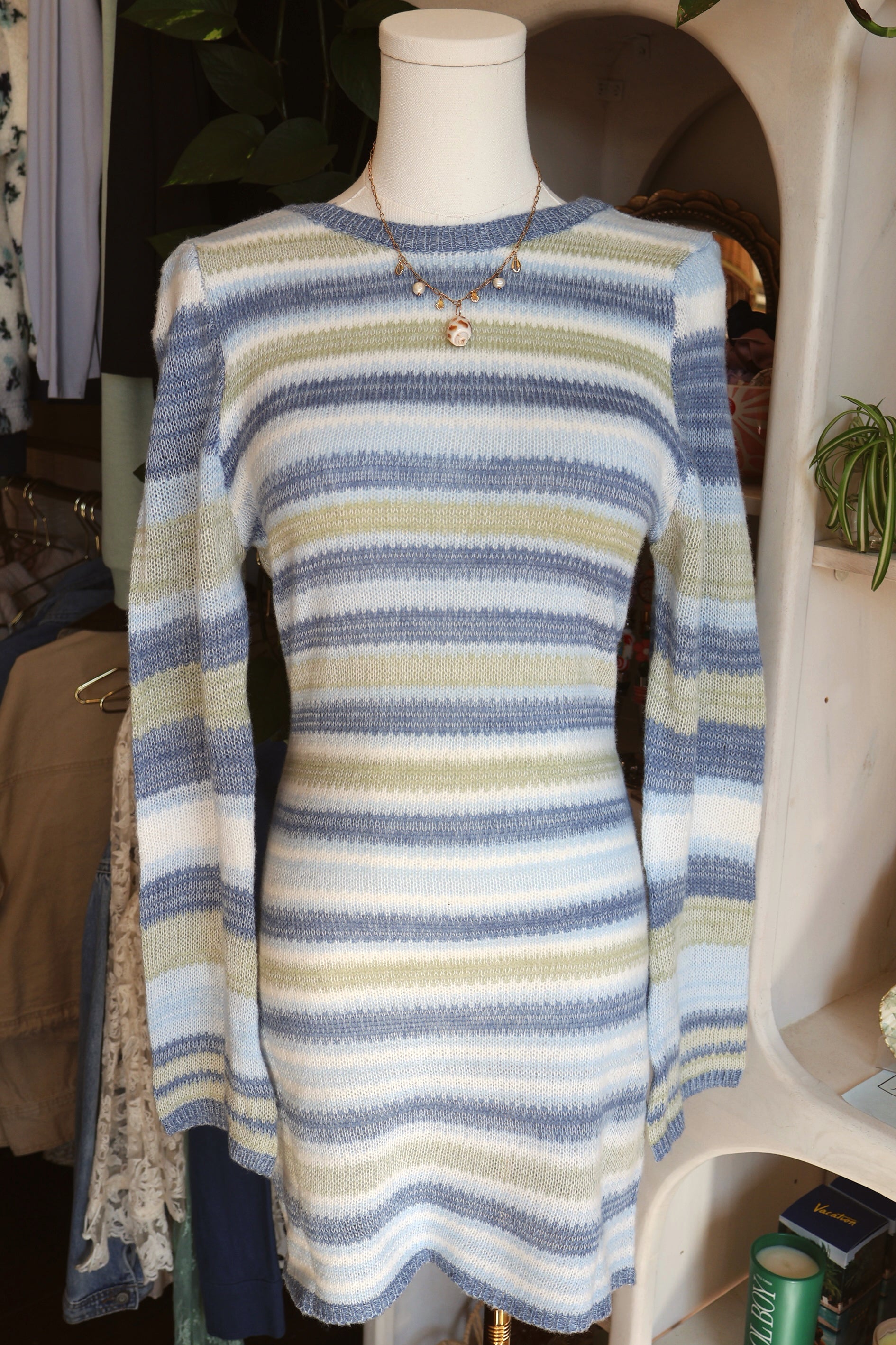 This lightweight knit sweater dress features soft blue and green stripes, flowy bell sleeves, and a flattering open-back design that ties for the perfect fit. With its breezy, semi-sheer feel and effortless silhouette, it’s the ultimate throw-on-and-go piece for beach days, brunch, or bonfires by the shore.