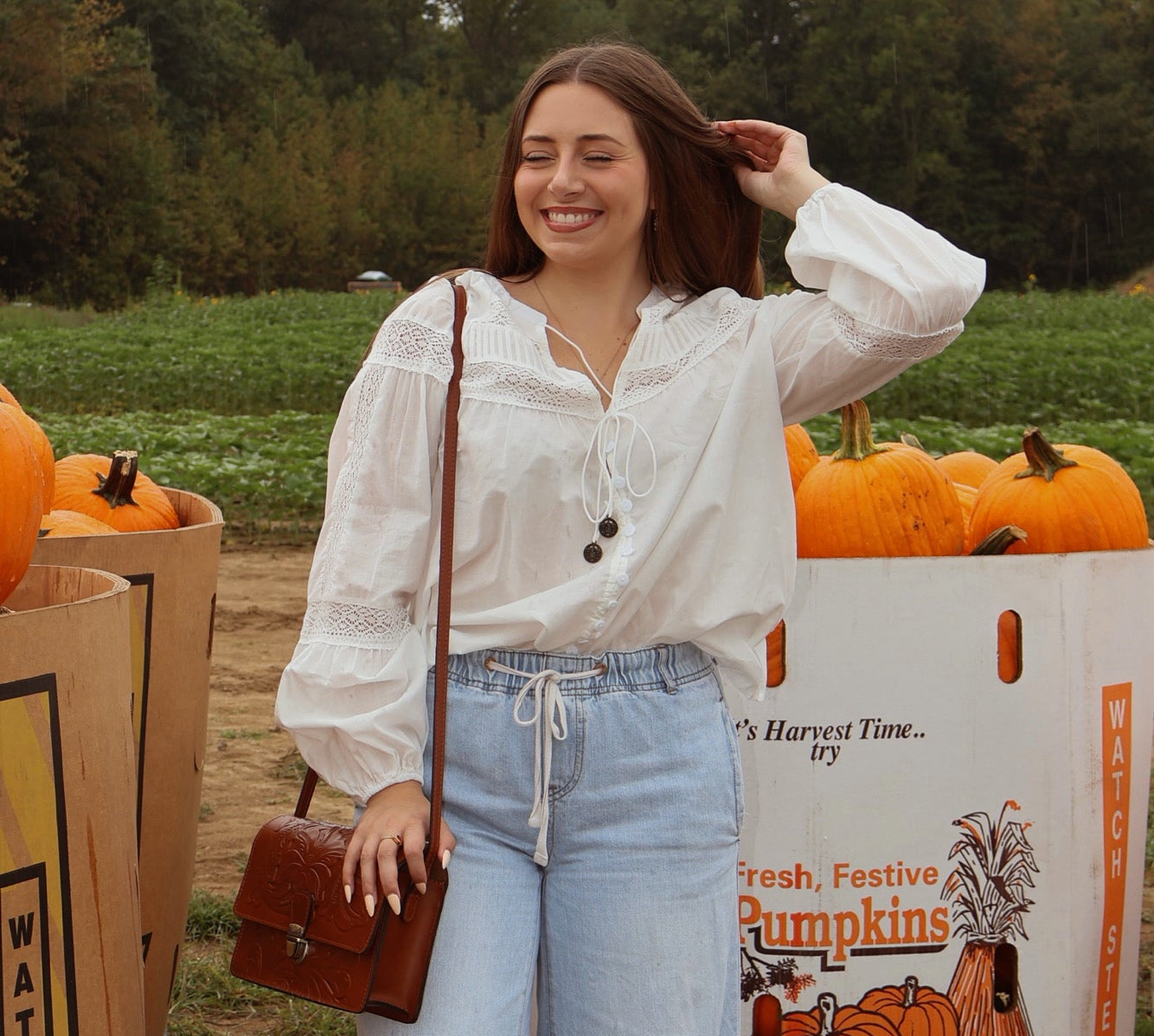 Effortlessly boho-chic, this white blouse features delicate lace detailing, billowy sleeves, and a tie-front neckline. Light and airy with a relaxed fit, it’s perfect for pairing with your favorite jeans or skirt for a timeless, free-spirited look.