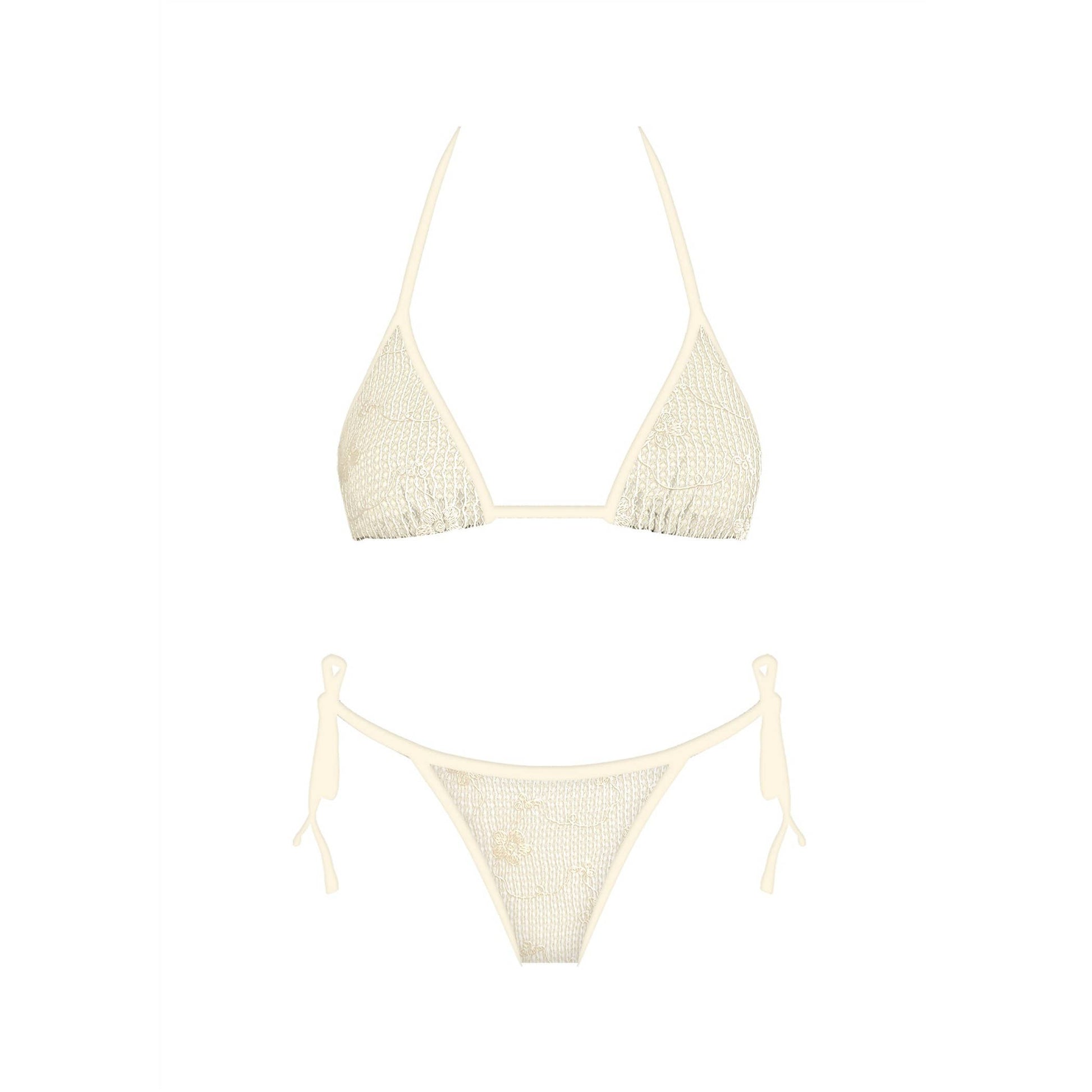 Embrace effortless beachside elegance with our Ivory Crochet Bikini Set. This delicate bikini features beautifully textured crochet in a soft ivory hue, capturing the light, airy essence of sun-drenched summer days. The classic triangle top highlights the intricate pattern, while slender halter straps tie at the neck and back, allowing you to adjust the fit for both comfort and support.