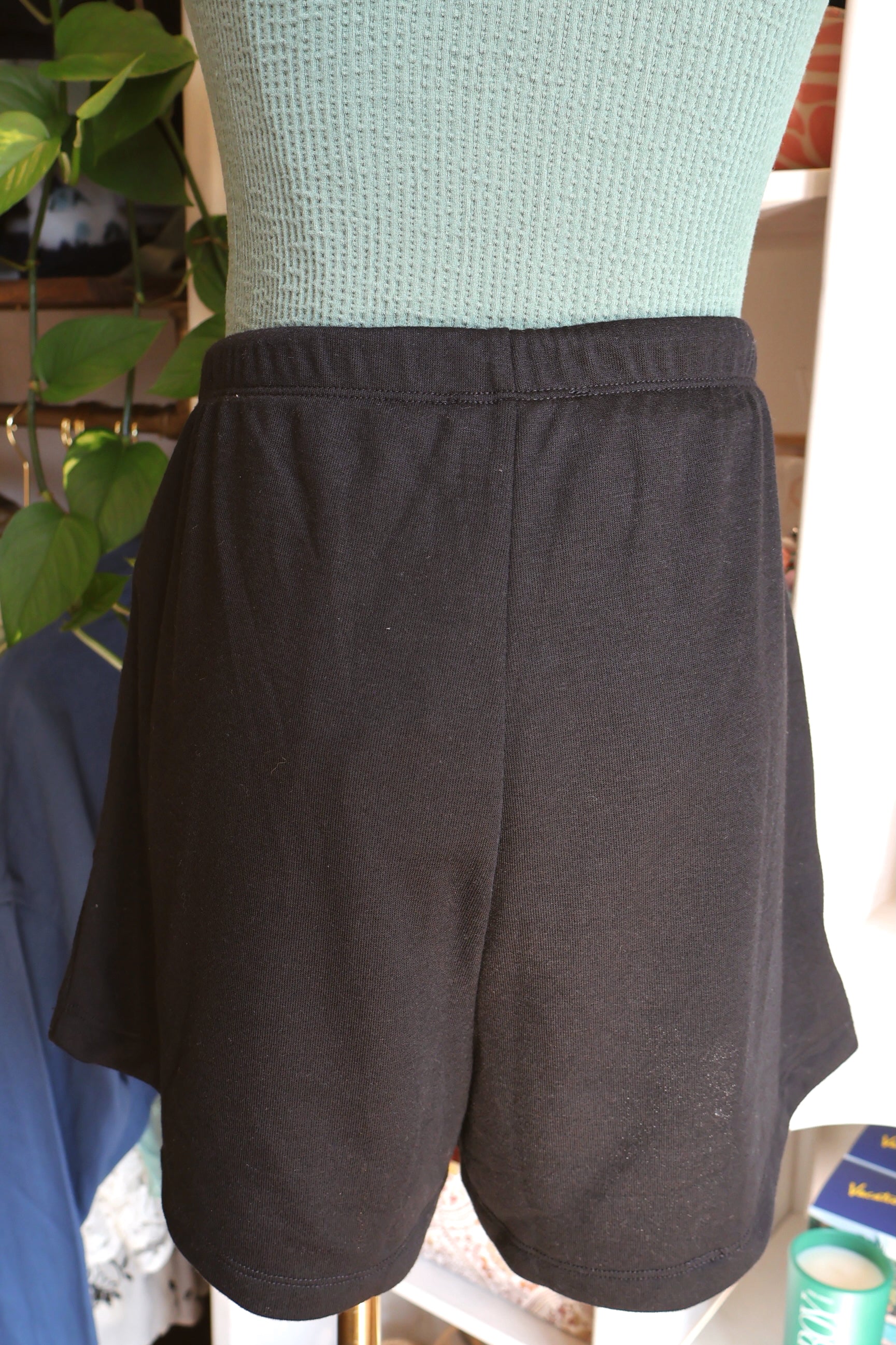 These black shorts feature a soft, relaxed fit, pockets, and a tie-string waist for the perfect touch of comfort and style.