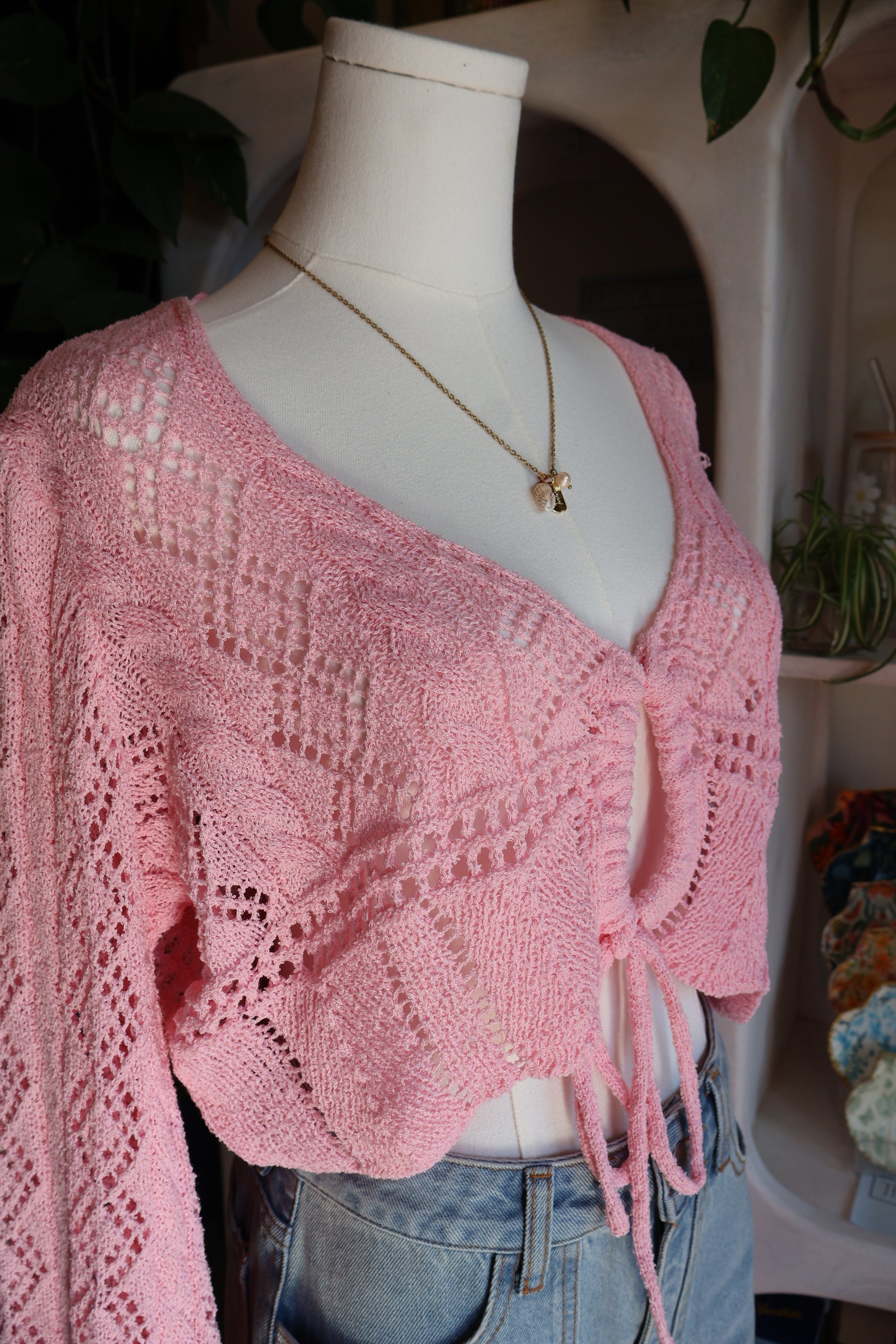 Soft, sweet, and a little flirty 💕 This pink crochet-style knit cardigan features a front tie closure, scalloped edges, and a lightweight open-knit design that’s perfect for layering.