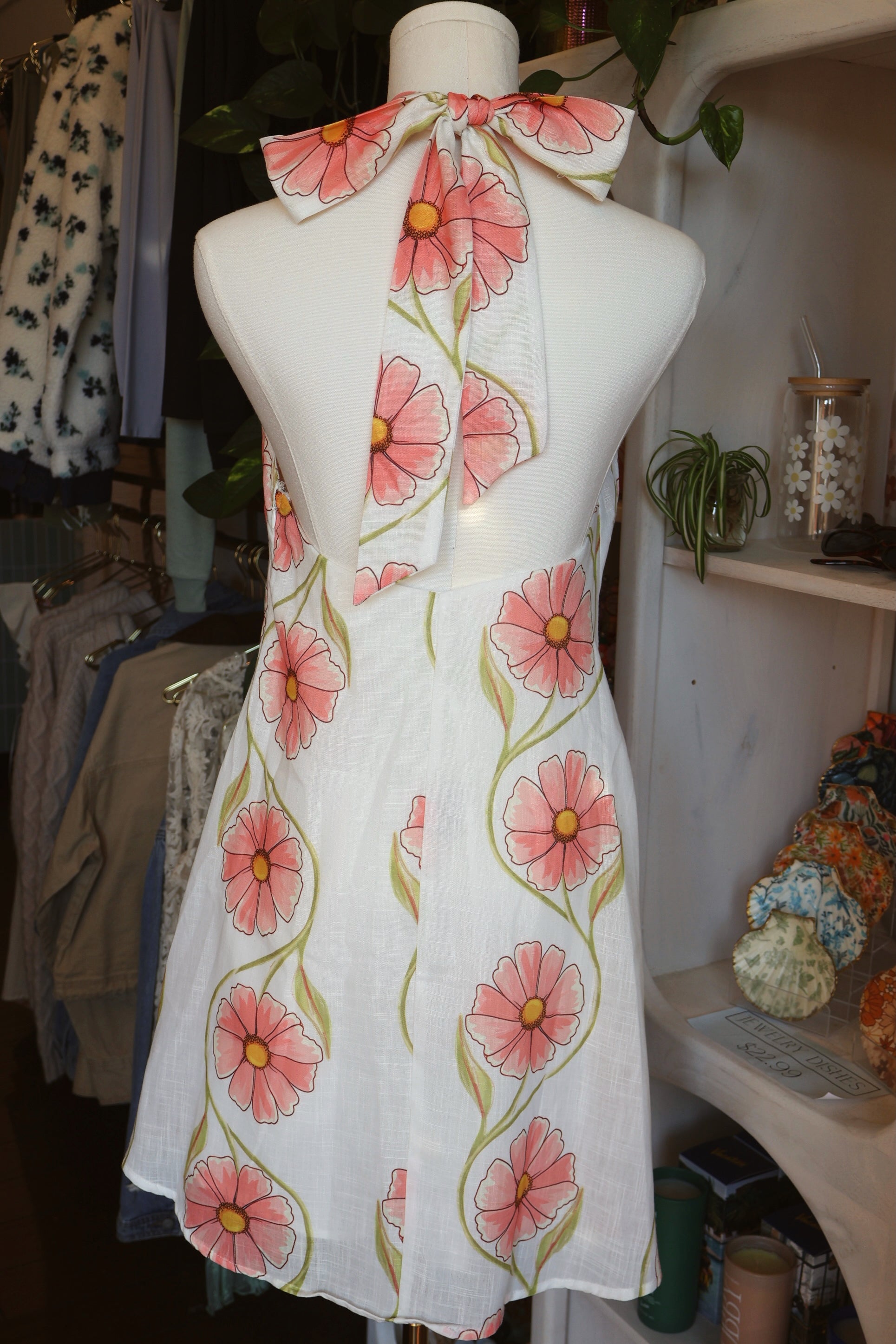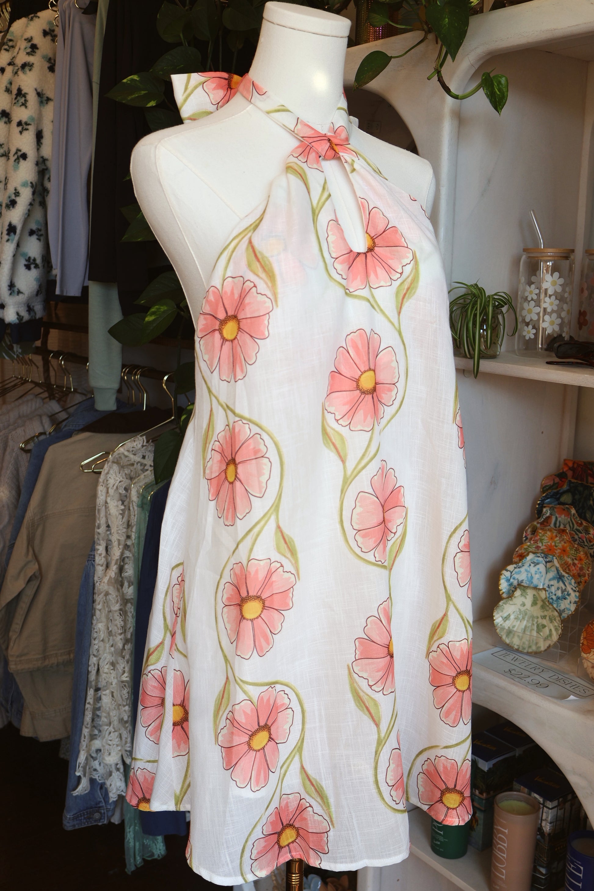 Charming pink floral retro dress with a halter neckline and tie-front detail, offering a flirty and vintage-inspired look.