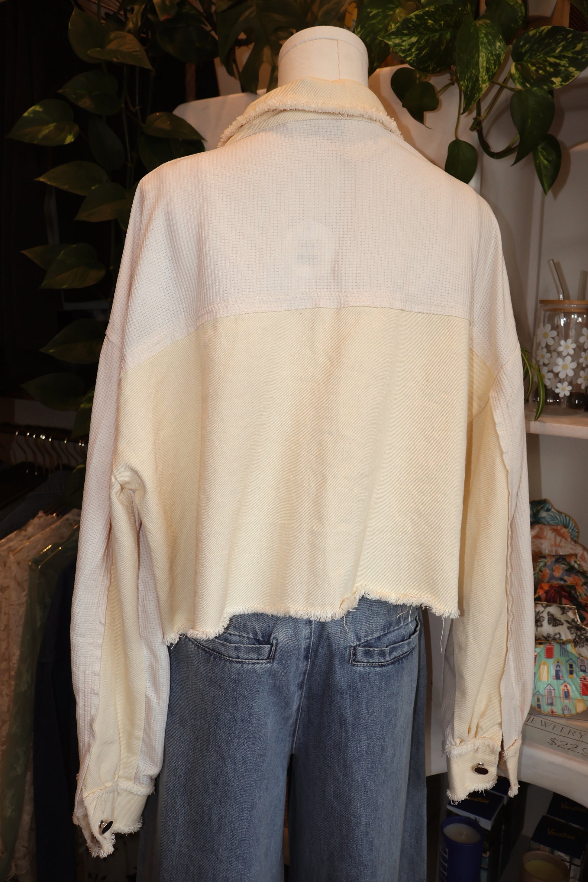 Cozy waffle patch jackets available in sunny yellow or soft pink. Each one features a relaxed, oversized fit with mixed patchwork detailing for that perfect laid-back, boho vibe—an easy throw-on layer for everyday style.